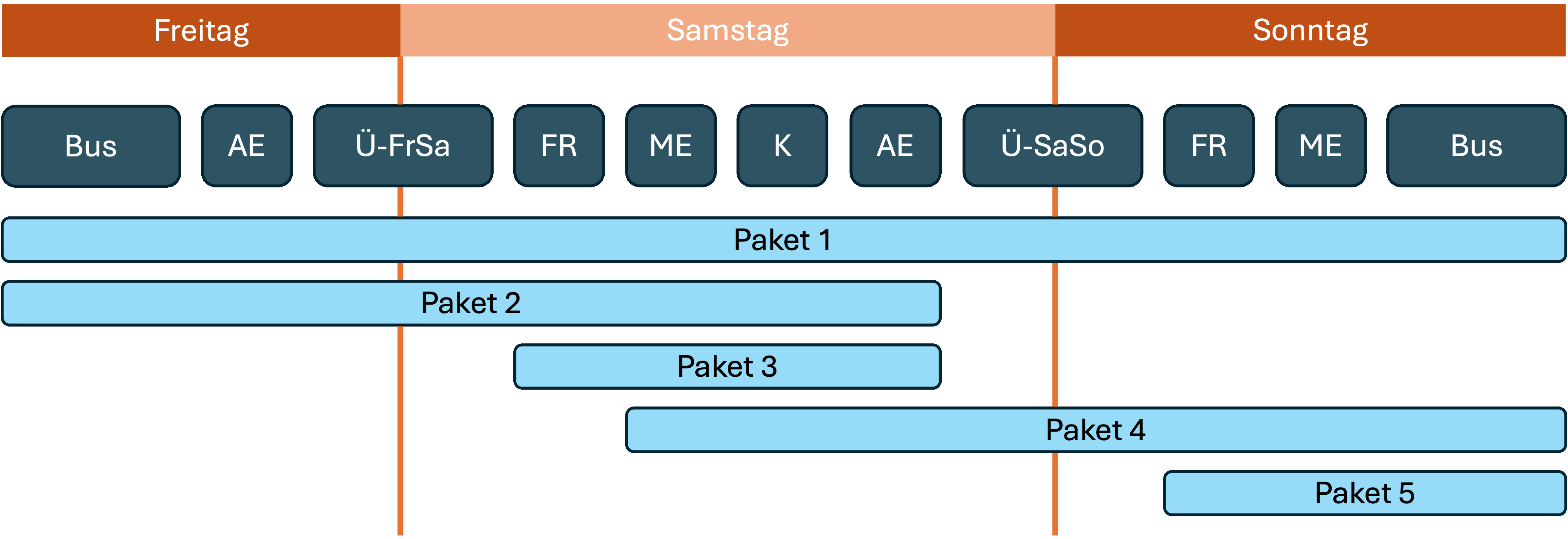 AE: Abendessen, Ü: Übernachtung, FR: Frühstück, ME: Mittagessen, K: Kaffee